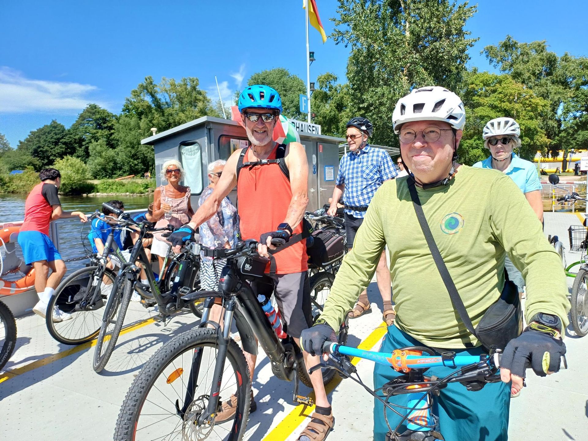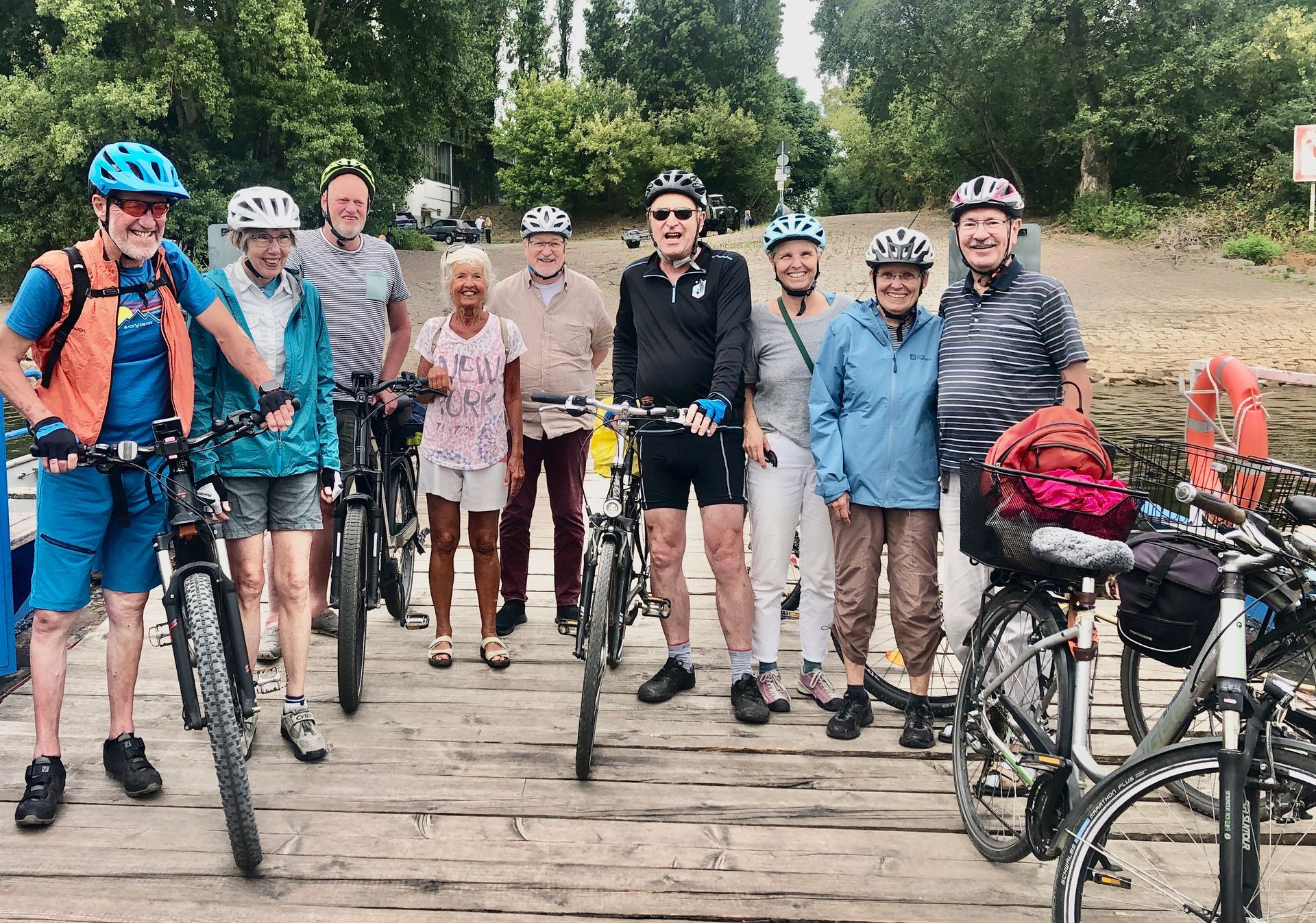 Die übrigen 9 Radlerinnen und Radler hatten sich eine größere Runde vorgenommen. Von Heddesheim aus ging es nach Viernheim. Weiter radelte die Gruppe auf einem schönen Weg durch die Viernheimer Heide, schon lange ein reizvolles Ziel für Naturliebhaber, bis nach Lampertheim. Angekommen am Rheinradweg gab es nach der Hälfte der Runde zur Stärkung erstmal eine Einkehr. Die zweite Etappe führte danach über den schönen Rheinradweg am Hauptdeich entlang bis nach Sandhofen. Hier folgte der Höhepunkt der Tour, die Fahrt mit der alten Rheinfähre auf die Friesenheimer Insel. Allein der gut gelaunte Fährmann war ein Erlebnis und trug zur guten Stimmung der Radlerinnen und Radler bei. Über die Friesenheimer Insel, vorbei an den gegenüberliegenden BASF-Werken, erreichte die Gruppe in gemütlicher Fahrt die Neckarmündung und bald auch Mannheim. Die letzten Kilometer führten dann über Seckenheim und Ladenburg zurück nach Schriesheim.