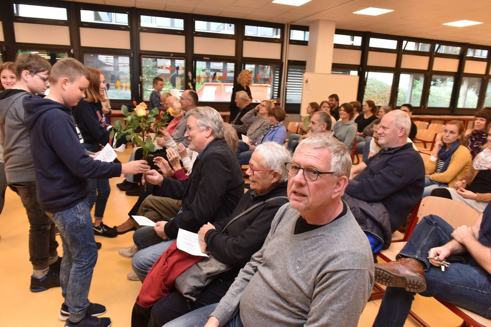 Wann haben Sie zuletzt eine langstielige Rose als Zeichen der Anerkennung und des Dankes überreicht bekommen? Diese Ehre wurde den Mitgliedern des Arbeitskreises Schriesheimer Senioren (ASS) zuteil, die sich seit fünf Jahren in der Hausaufgabenbetreuung an der Realschule engagieren. Anlässlich des 5-jährigen Jubiläums dieser Zusammenarbeit zwischen Realschule und ASS hatte die Schule zu einem Umtrunk eingeladen. Dieser entpuppte sich dann als Feierstunde voller freudiger Überraschungen. Schüler der 6. Klassen gaben rhythmische Melodien auf Plastikröhren zum Besten und mit einem eigens für diese Veranstaltung getexteten Lied auf die Melodie von „Don’t worry be happy“ erging ein Dank der ganz besonderen Art an die Aktiven des ASS, denen schließlich die eingangs erwähnten Rosen durch die Schüler persönlich überreicht wurden. Mit lobenden Worten für die Ehrenamtlichen des ASS dankte Frau Bückmann im Namen der Schule. Seit Beginn der Kooperation im März 2014 ist sie die Ansprechpartnerin und Organisatorin seitens der Realschule. Von ihr erhielt jeder von uns eine Tüte mit stärkenden Überraschungen, fest wie flüssig. „Das passt perfekt“, fasste Winfried Plesch vom ASS als Koordinator der Zusammenarbeit mit der Schule seinen Dank an Frau Bückmann kurz und bündig zusammen und überreichte ihr einen bunten Herbststrauß und eine Packung Pralinen „gegen den November-Blues“. Dem vollzählig anwesenden Lehrerkollegium (!) sprach er seine Hochachtung für deren tägliche pädagogische Arbeit aus.