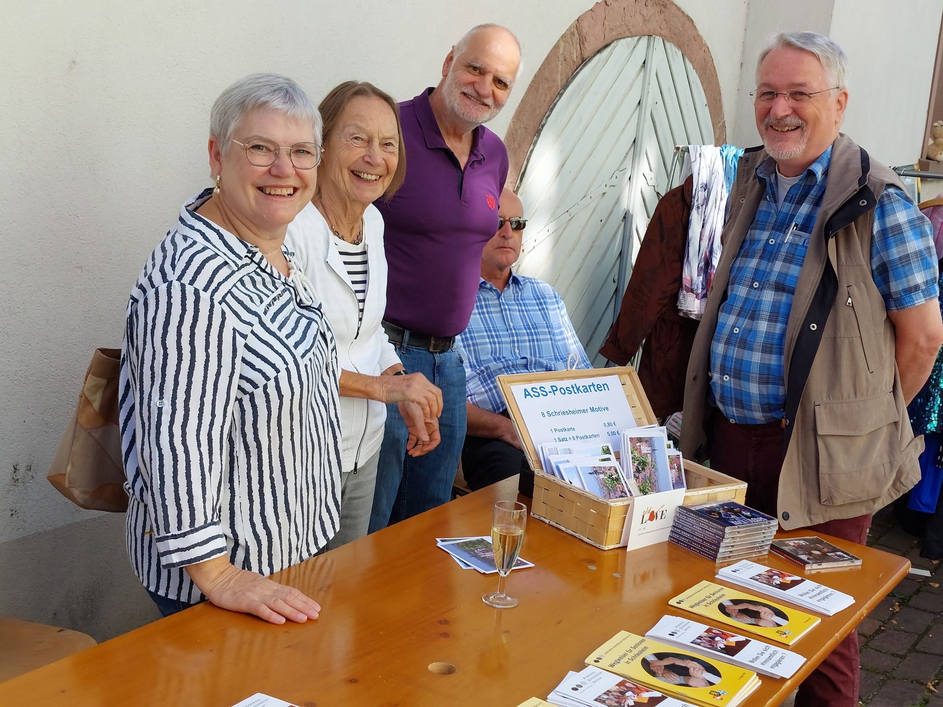 Beim diesjährigen Straßenfest war auch der Arbeitskreis Schriesheimer Senioren (ASS) mit einem Stand vertreten. Wir haben die Gelegenheit genutzt, um über wieder einmal über unsere vielen ehrenamtlichen Aktivitäten zu informieren. Diese sind fast alle auch in unserem „Wegweiser für Senioren“ aufgeführt, den man sich mitnehmen konnte. Vielseitig sind aber auch die Aktivitäten für uns selbst, wie beispielsweise die gemeinsamen Feiern in geselliger Runde und die verschiedenen Interessengruppen, die sich inzwischen gebildet haben, wie etwa die Fotogruppe, die Spiele-Runden oder die sportlichen Betätigungen. Großen Anklang fanden darüber hinaus die CDs unser Jazzband „Old Love“ und unsere selbst entworfenen Ansichtskarten mit Schriesheimer Motiven, die wir für einen guten Zweck verkauft haben.