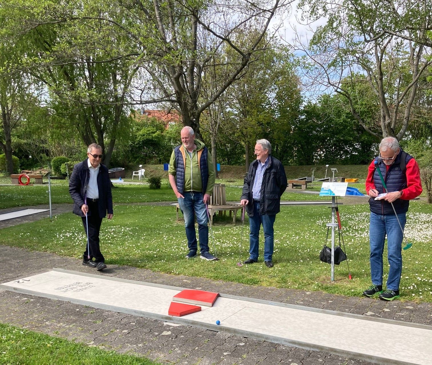 Der eigentliche Start der diesjährigen Minigolfsaison, der für Anfang April vorgesehen war, ist für die Mitglieder des Arbeitskreises Schriesheimer Senioren (ASS) buchstäblich ins Wasser gefallen. Nun konnten wir aber beim zweiten Anlauf bei schönstem Sonnenschein mit dem Spielen auf der Anlage des Miniaturgolfsportclubs Schriesheim (MCS) am Wiesenweg beginnen. Inzwischen sind wir nun bereits das 4. Jahr in Folge dort zum Minigolfen und freuen uns darüber, dass wir schon einigermaßen erfolgreich beim Einlochen des kleinen Balles geworden sind. Angenehm ist vor allem, dass wir uns dort nach dieser nicht zu anstrengenden sportlichen Betätigung noch gemütlich zusammensetzen, schwatzen und unsere nächsten Aktivitäten planen können.