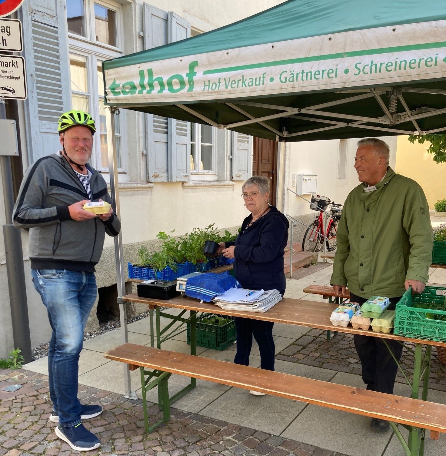 Erfolgreich gestartet ist in der vergangenen Woche der Talhof-Marktstand am neuen Standort neben dem Gemeindehaus der evangelischen Kirche, gegenüber vom Begegnungszentrum „mittendrin“. Danach werden weiterhin freitags von 9 bis 13 Uhr die Erzeugnisse der Talhof-Gärtnerei von den freiwilligen Helfern des ASS verkauft.