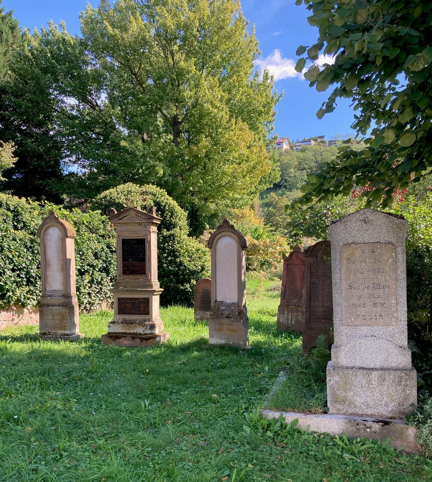 Am Tag des Offenen Denkmals, am 10. September 2023, hat Maren Fahmi, Mitglied im Arbeitskreis Schriesheimer Senioren (ASS), bei einer Führung über den jüdischen Friedhof über die Familiengeschichten der Schriesheimer Juden berichtet. Diese lebten von 1651 bis 1939 hier im Ort, sie mussten ihre Toten aber zuerst etwas entfernt auf dem jüdischen Friedhof in Hemsbach beerdigen. Erst 1874 konnten sie dann das Landstück für einen eigenen Friedhof erwerben. Zu dieser Zeit bestand die hiesige jüdische Gemeinde aus etwa 110 Personen. Die erste Beisetzung auf dem jetzigen Friedhof fand 1874 statt, die letzte Beisetzung war im Juli 1935. Bei dem Rundgang wurden die verschiedenen Grabsteine angeschaut, die hebräischen und deutschen Inschriften gezeigt und auch die Eingangs- und Schlussklauseln erklärt. Zum Schluss wurde noch das Mahnmal angesehen, dass im Februar 2004 für die im Oktober 1940 in das südfranzösische Lager Gurs deportierten Schriesheimer Juden errichtet worden ist. Zu der Führung waren 24 Besucherinnen und Besucher gekommen, die sehr interessiert an der Geschichte der jüdischen Bewohner in Schriesheim waren und viele Fragen dazu stellten.