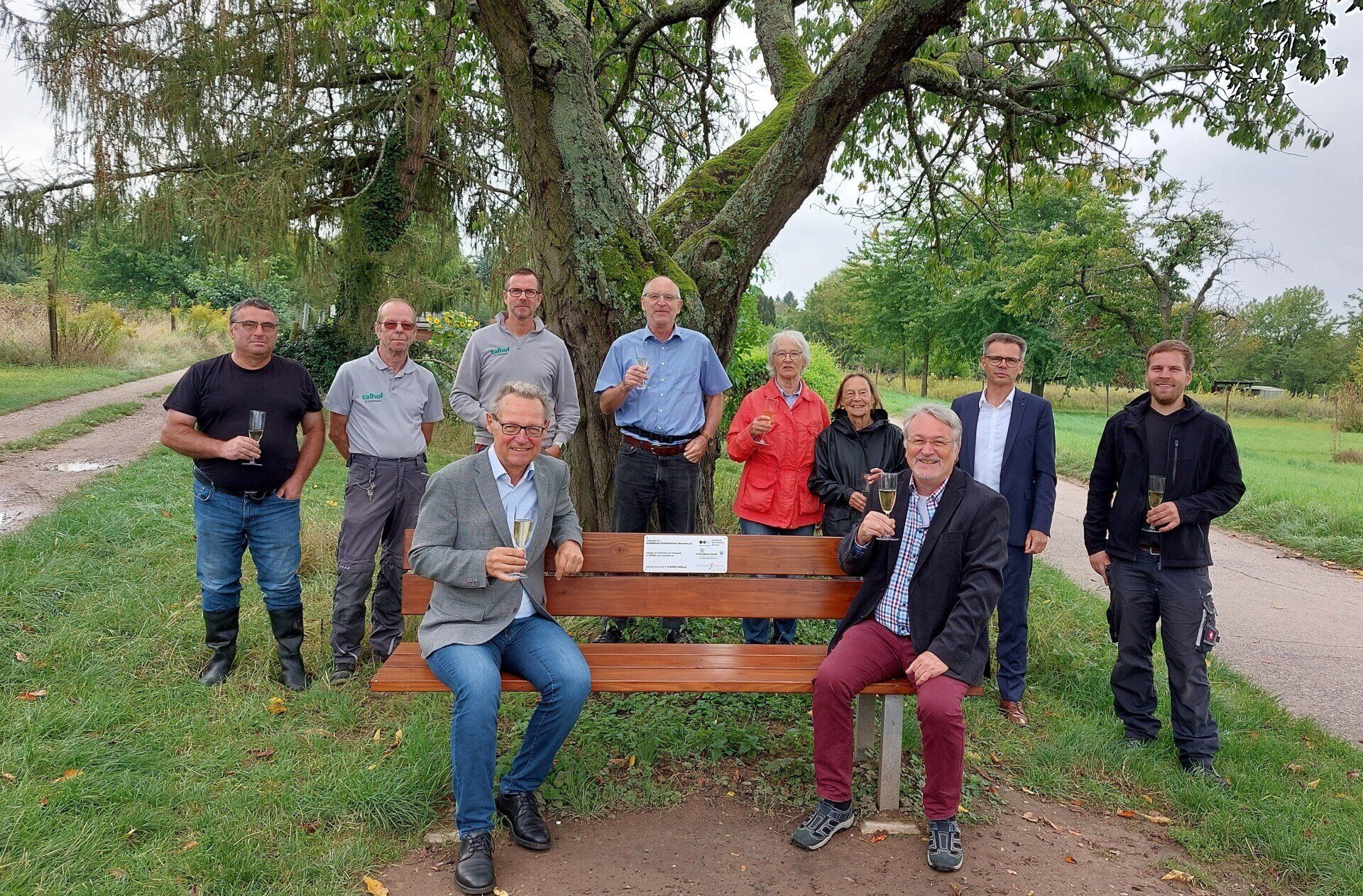 Jetzt, Mitte September 2021, konnte endlich die offizielle Übergabe an die Stadt Schriesheim erfolgen. Im Beisein von Vertretern des großzügigen Sponsors, der H+G-BANK Stiftung, von Vertretern der Schreinerei und Schlosserei des Talhofs als Hersteller der Bänke, von Mitgliedern der Familien Morast und Wehweck als Grundstückseigentümer und von Vertretern der regionalen Presse wurde mit einem Glas (Schriesheimer) Sekt und großzügig gespendeten Backwaren der Bäckerei Heiß die offizielle Übergabe an Bürgermeister Höfer vorgenommen. Der dankte dem ASS sowohl für diese Spende als auch für dessen soziales ehrenamtliches Engagement für Schriesheim im Allgemeinen. Auch Herr Hoffmann vom Vorstand der H+G-Bank lobte das Projekt, er überlege schon, seine Kollegen im Rahmen eines Betriebsausflugs nach Schriesheim zu diesen Bänken zu lotsen, vielleicht als Vorstufe zu einer anschließenden Weinprobe bei einem der regionalen Winzer.