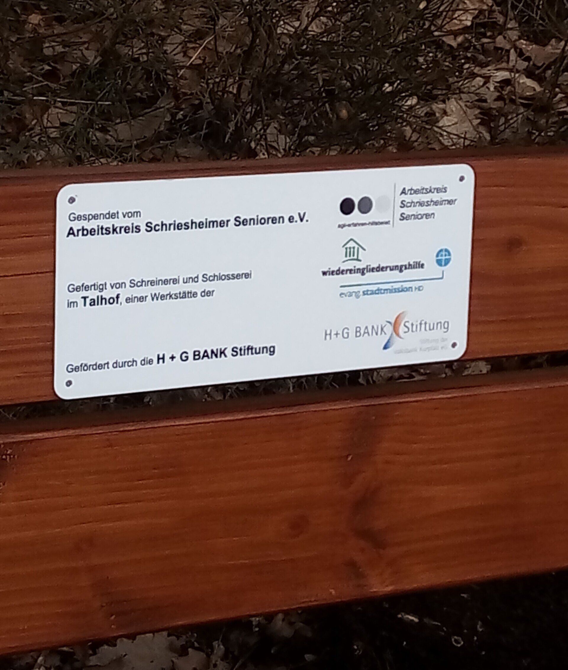 Erheblich unterstützt wurde unser Vorhaben durch eine großzügige Spendenzusage der H+G Bank Stiftung, die indirekt damit auch den Hersteller der Bänke, den Talhof, die Schriesheimer Werkstätte der Wiedereingliederungshilfe, fördert, denn wir haben die Bänke nicht im Internet oder Katalog ausgesucht, sondern bei diesem regionalen, im sozialen Bereich aktiven Unternehmen am Ort geordert. Sehr bedanken möchten wir uns bei zwei alteingesessenen Schriesheimern, die unser Vorhaben freudig aufnahmen und bereitwillig erlaubt haben, Bänke auf ihren Privatgrundstücken entlang der Spazierwege aufzustellen.