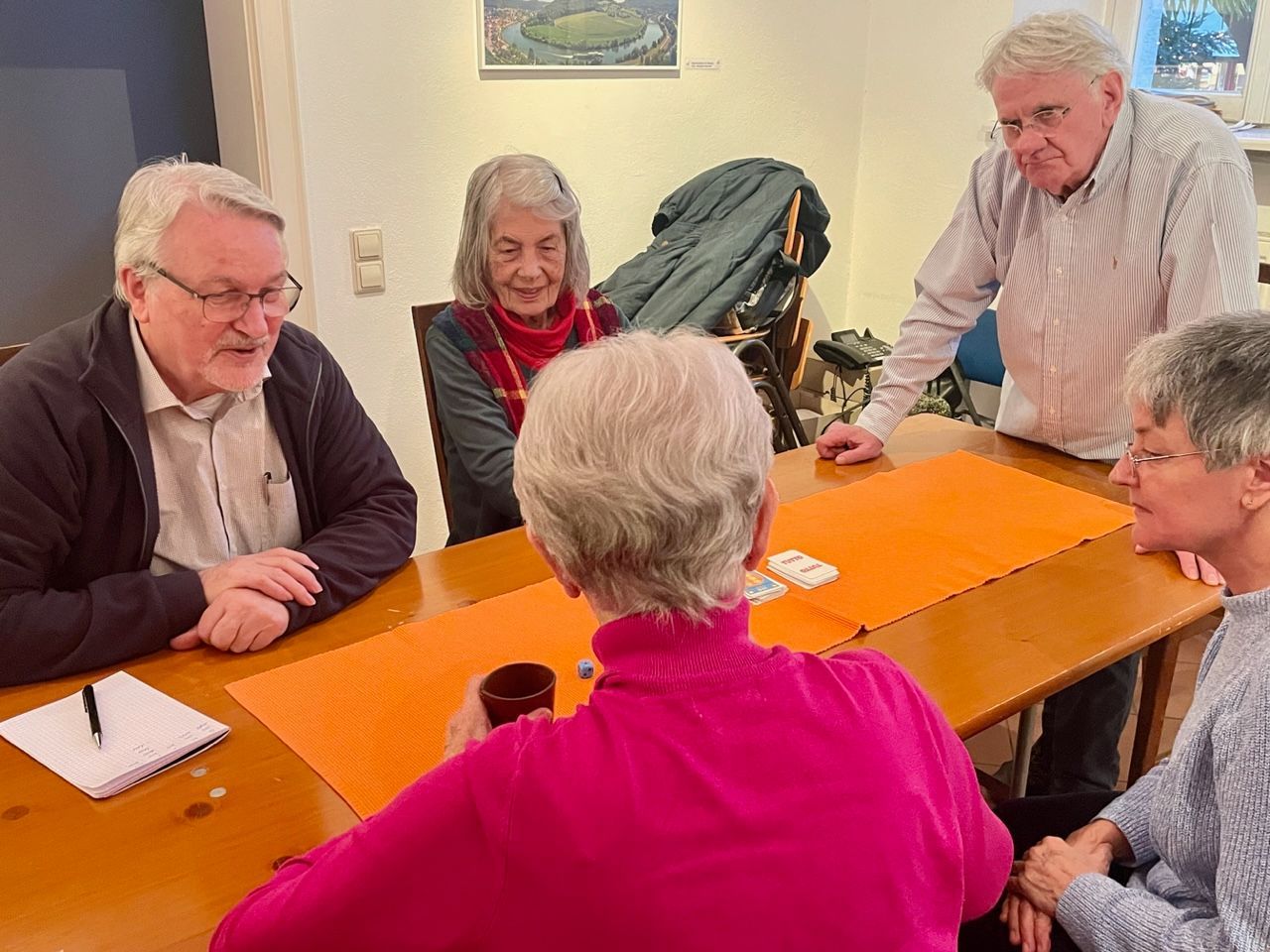 An diesem trüben Mittwochnachmittag brennt Licht im ASS-Büro im Schriesheimer Stadtarchiv. Brennt es noch von den Bürostunden am Vormittag? Ausgeschlossen! Nein, heute ist der Spielenachmittag angesagt, der bisher einmal im Monat stattfindet. Schon seit den Anfangsjahren unseres Vereins gibt es dieses Angebot – und es wird gern genutzt. Waren es zu Beginn zwar deutlich mehr Teilnehmer, oft gab es zwei Spieltische, so sind es heute fünf bis sechs Personen, die regelmäßig teilnehmen. Sie finden inzwischen an einem Tisch Platz. Ich komme dazu, als gerade eine Runde „Tutto“ im Gang ist. Mit sechs Würfeln und zahlreichen Aktionskarten gilt es, möglichst schnell 5000 Punkte zu sammeln. Besonders wichtig sind die gewürfelten Einser, Fünfer und Dreier-Pasche. Ob man sich sicher erreichte Punkte aufschreiben lässt oder alles bis zum Ende ausreizt, ist wohl eine Persönlichkeitsfrage. Denn würfelt man einen Zug, bei dem kein gültiger Würfel oder Drilling dabei ist, verfallen alle Punkte, die in diesem Zug gesammelt wurden. Ich gehe zunächst großes Risiko und gewinne kaum Punkte. Irene macht das anders, denn sie sammelt auch scheinbar wenig Punkte, was ihr am Ende den Sieg beschert. Und dies gleich zweimal. Ich nehme mir ein Beispiel an ihrer Taktik und komme damit auch fast ans Ziel. Allerdings nur fast. Vielleicht hätte ich doch so risikofreudig sein sollen wie Peter, dem im Eifer des Gefechts auch schon mal ein Würfel aus dem Becher hüpft? Egal, es geht nicht um Platzierungen, sondern um den Spaß am Spiel. Und den haben alle, das merkt man sofort. Eine schöne Zugabe ist dabei noch das Training der grauen Zellen, denn Kopfrechnen gehört bei diesem, aber auch fast allen anderen Spielen dazu.
